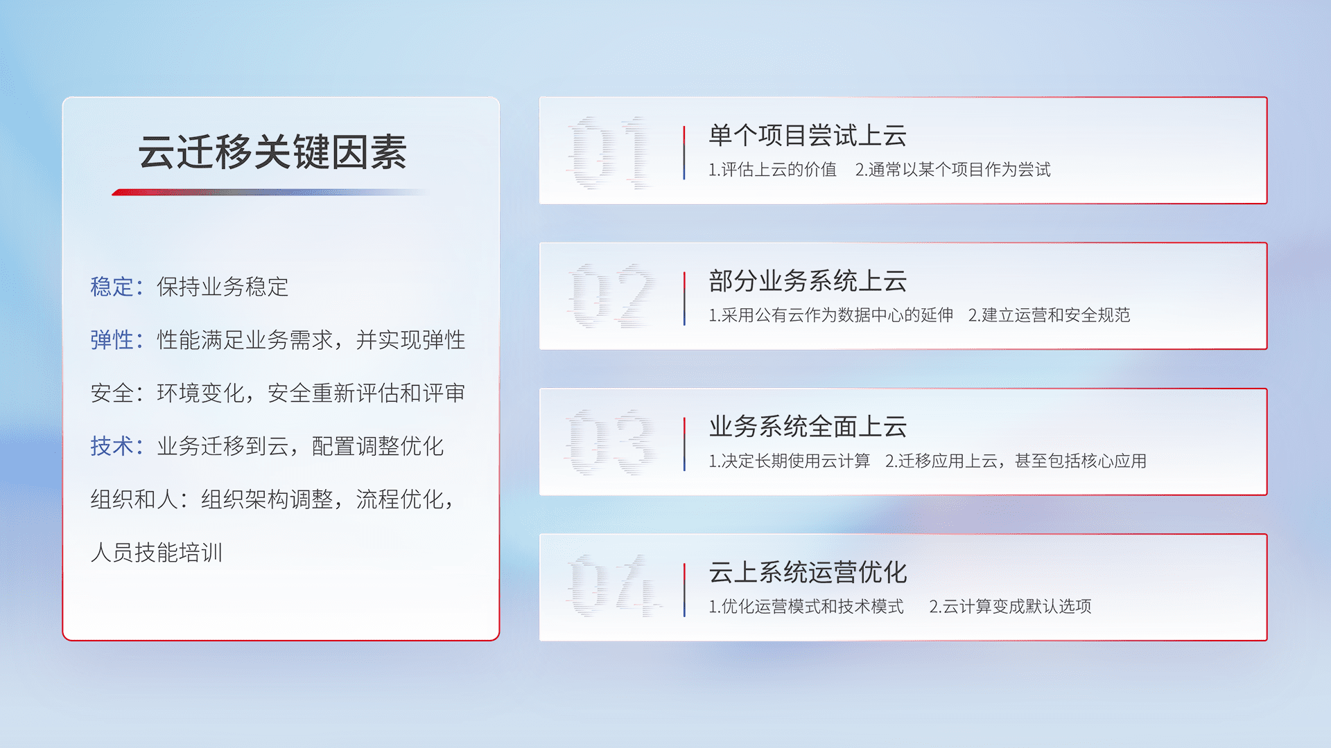 结合实际业务,,,从规划设计、、云平台选型、、云原生改造、、、、数据迁移、、、集成交付,,,,迁移全过程为客户识别最佳上云路径,,,,做好风险识别管理,,设计网络架构、、、身份权限、、、安全审计合规、、、操作审计、、日志审计、、、监控告警策略、、多站点容灾设计等,,对云上基础设施进行整体规划,,提升IT治理水平,,,以满足弹性、、高可用、、、高性能的需求。。。。