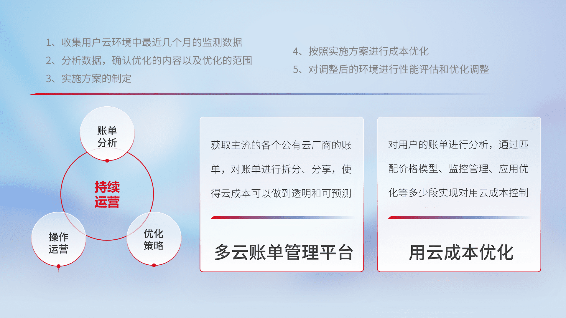 通过多云纳管,,以统一的资源数据模型把客户的云资源进行抽象和封装,,进而实现对多云资源的统一操作,,保障云资源管理的可靠性、、、稳定性与可用性。。。量身定制化运维内容,,,配置、、、开发运维、、补丁管理、、、、备份、、监控、、认证和访问管理、、、、审计和日常巡检等,,,保障在用云过程中的可靠度,,,稳定度以及高可用率。。。